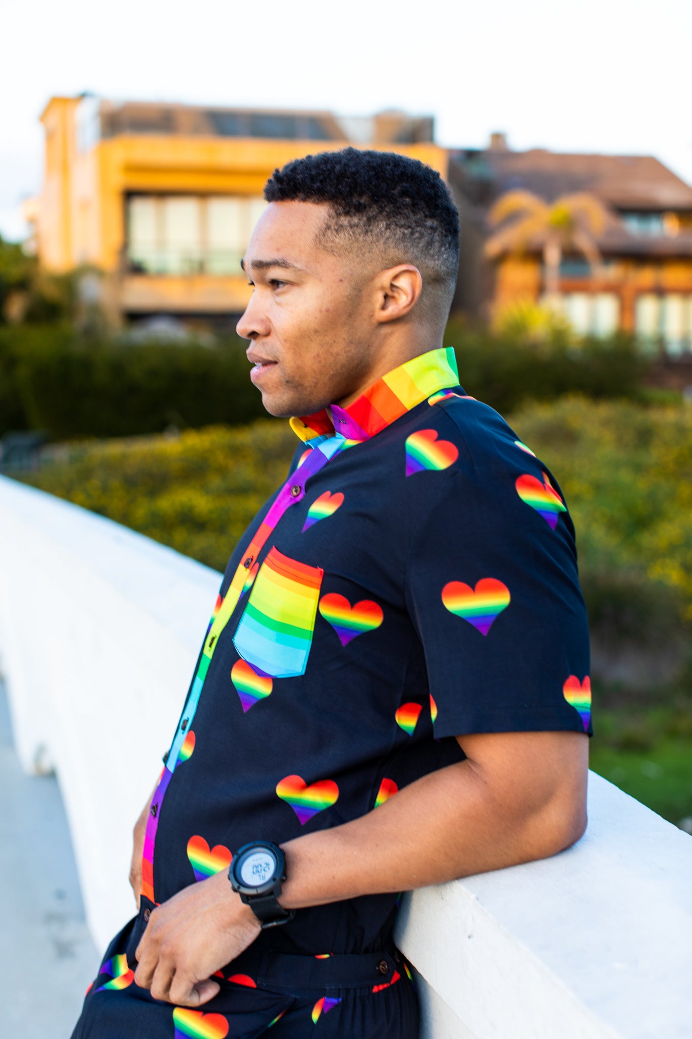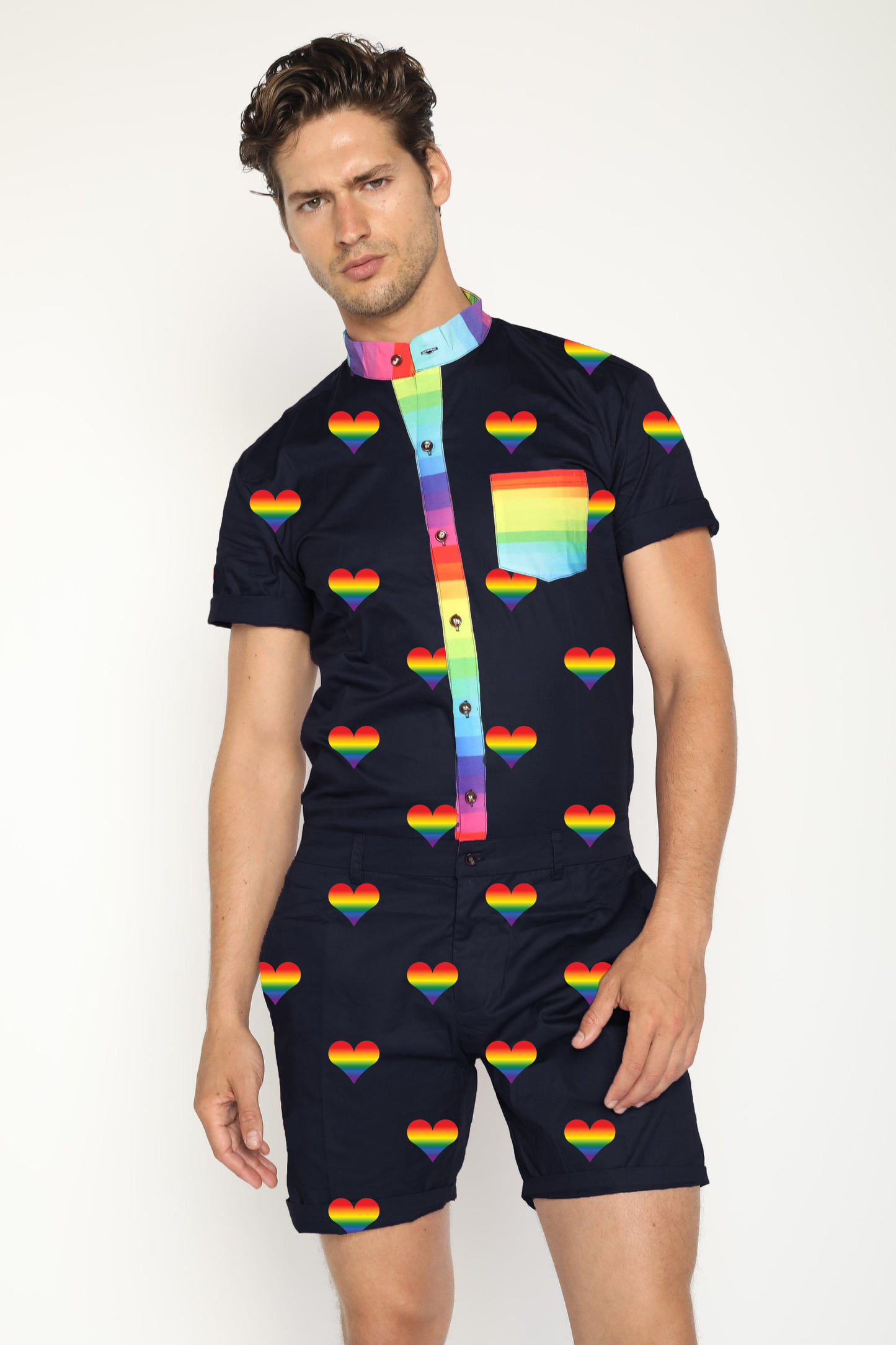 - Pride Color: Be the standout in the crowd with this vibrant pride rainbow romper that effortlessly blends masculinity and modernity. Take it to the next level by pairing it with sneakers, sandals, or your favorite jacket.