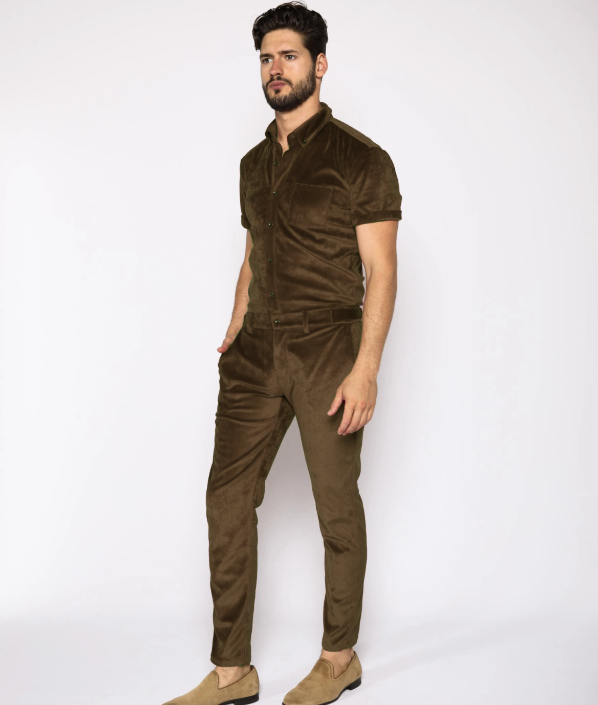 The Olive Green Velvet Jumpsuit is a great color that is perfect for any festive occasion.